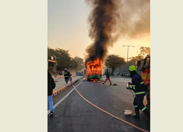 According to officials, the fire is suspected to have been caused by a short circuit in the bus battery. On receiving information from the control room at around 3:15 pm, two fire service teams rushed to the spot and brought the blaze under control within a short time.