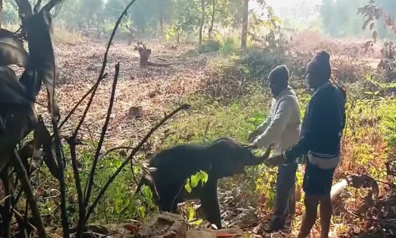 Deogarh: Forest officials on Friday successfully rescued a one-month-old elephant calf that was trapped in a fishing net at Rengali Dam in Chasagurujanga village under the Thianal Section of the Barkote range in Deogarh Forest Division.