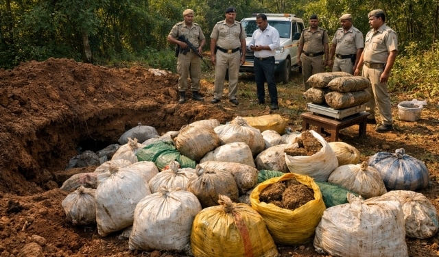 Acting on specific intelligence, SDPO R. Udayagiri Rakesh Kumar Sahu led a joint team from R. Udayagiri Police Station and Chandragiri outpost. Officers recovered 67 plastic sacks filled with cannabis from beneath the soil. An Executive Magistrate supervised the weighing process, confirming a total of 210 kilograms.